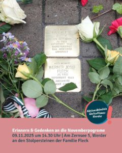 Anlässlich des Jahrestags der Reichspogromnach am 09. November 1938, laden wir ein zum öffentlichen Gedenken an der Stolpersteinen der Familie Fleck. Anschließend erinnern wir mit einer Lesung und Musik an den Holcaust-Überlebenden Walter Frankenstein.